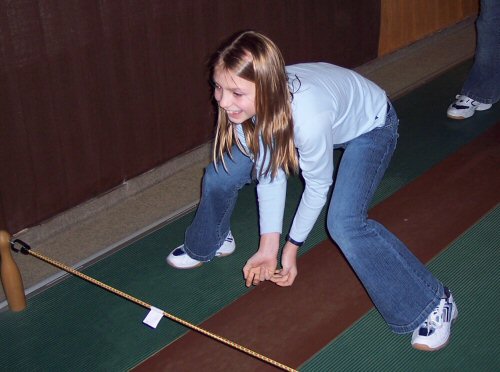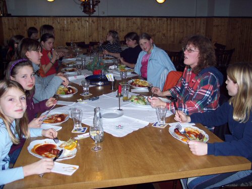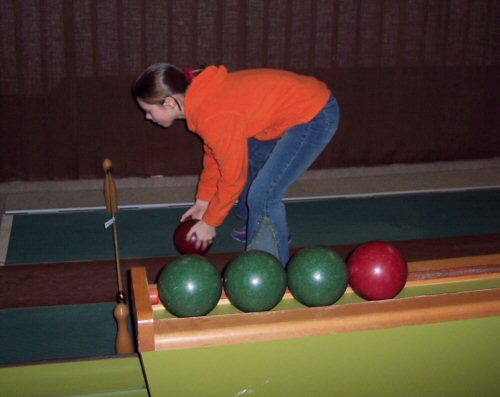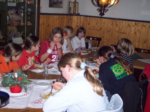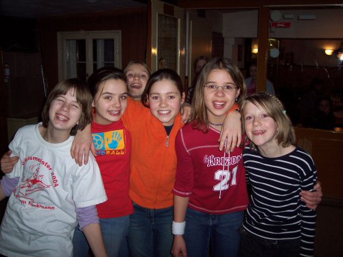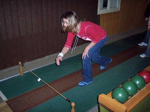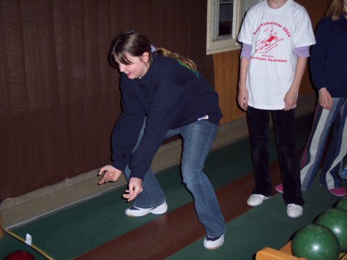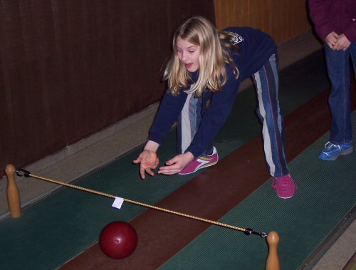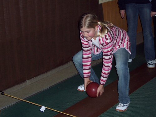 Kurz vor Weihnachten, am 23. Dezember 2004, trafen sich die jüngsten Handballerinnen des TSV Schöppenstedt in der Gaststätte „Zum Zoll“, um den bisher positiven Verlauf der Saison gebührend zu feiern. Trotz einer schmerzlichen Niederlage am voran gegangenen Wochenende, gegen einen sehr aggressiv spielenden TC Schöningen, stehen die Mädchen immer noch an der Tabellenspitze. Das verlorene Spiel war allerdings am 23. schon unter der Rubrik „ist halt passiert“ abgeheftet und so konnten die Mädchen sich bei ausgelassener Stimmung beim Kegeln richtig austoben. Selbst beim Umgang mit so einer kleinen, schweren Kugel haben sich die Mädels sehr geschickt gezeigt, sodass die Trainerin ihre Mühe hatte, bei den Spielen nicht all zu schlecht auszusehen. Nach den Spielen wurde gemeinschaftlich gegessen was (wie bei Personen weiblichen Geschlechts üblich) mit viel Gequassel und Gelächter vonstatten ging. Hoffentlich kann diese gute Stimmung in die zweite Runde der Saison mitgenommen werden. | Bilder zum Bericht klicken zum Vergrößern |
