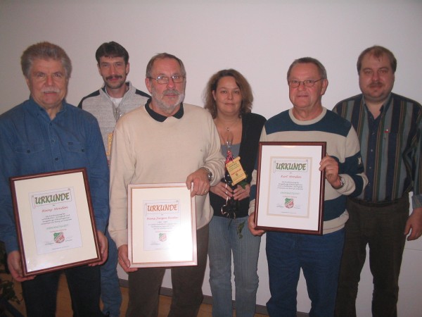 Während der jährlichen Versammlung der Tischtennis-Abteilung des TSV Schöppenstedt wurden verdienstvolle Mitglieder geehrt. Kurt und Heinz Monden wurden für langjährige Abteilungstreue zu Ehrenmitgliedern ernannt. Beide Aktive sind seit weit über 40 Jahren Spartenmitglied. Hans-Jürgen Bieder erhielt eine Ehrenurkunde für seine 25jährige Trainertätigkeit im TSV Schöppenstedt. In dieser Zeit leistete er mehr als 4000 Stunden für den Tischtennisnachwuchs im TSV Schöppenstedt. Undine Stichnoth und Frank Kühl wurden für ihre über 20jährige Arbeit als Mannschaftsführer geehrte. Abteilungsleiter Thomas Föniger lobte das jeweilge Engagement und überreichte den Jubilaren Urkunden und Präsente. | Bilder zum Bericht klicken zum Vergrößern |