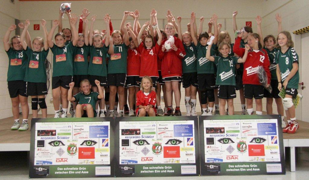 Nun liegt der Eulenspiegel-Cup 2011 schon wieder hinter der Handballabteilung des TSV Schöppenstedt. Über 50 Mannschaften trugen an zwei Tagen in 19 Stunden ihre Spiele aus. Dass solch ein Turnier in dieser Größe und Länge überhaupt machbar war, lag an der großen Unterstützung der Handballeltern, Seniorenspieler, Schiedsrichter, Sponsoren und Kooperationspartner der Handballer. Die Handballabteilung möchte sich zudem bei Andrea Pukropski und Ulrike Schulz bedanken. Beide stellten eine Riesentombola zusammen, die ihrer gleichen sucht. Insgesamt gab es über 1000 Gewinne, die vom LED-TV bis zum Kugelschreiber reichten. Aber auch Legospielzeug, Essengutscheine, Toaster und sogar Gartengeräte wurden verlost. Dafür möchte sich Abteilungsleiter Michael Duderstadt bei allen ortsansässigen Firmen, aber auch bei den überregionalen Spendern, für ihre tolle Unterstützung bei der Tombola bedanken. Zudem geht auch ein großer Dank an die Verantwortlichen des Mehrgenerationenhauses, welches der Handballabteilung am gesamten Wochenende zur Verfügung stand und von den Handballern zur Fanmeile umfunktioniert wurde. So konnten sich die Gäste unabhängig vom Wetter mit Kaffee und leckerem, selbstgebackenem Kuchen der „Handballmamis“ verwöhnen lassen. Am Samstag war dann auch Till Eulenspiegel bei „seinem“ Handballturnier zu Gast und „bespaßte“ das Publikum aus nah und fern. Unter der Leitung von Anja Rösner kümmerten sich 25 Stammhelfer und rund 60 weitere Helfer um den Spielbetrieb, das Catering und um das restliche Drumherum solch einer Veranstaltung. Auch der Handballstand, der das erste Mal beim St. Stephanusmarkt zum Einsatz kam, war wieder vor Ort. Mit ihm konnten nun auch die Handballer ihr Logo in einer Größe von 1 mal 1,20 Meter präsentieren. Das Logo wurde von Julian Kruse noch gerade so rechtzeitig vor dem Eulenspiegel-Cup 2011 fertig gestellt und an die Handballer übergeben. | Bilder zum Bericht klicken zum Vergrößern |